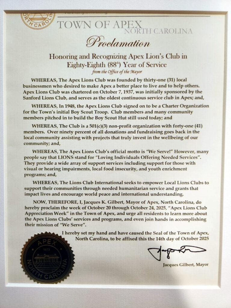 At the October 14, 2025 Town Council meeting, the Apex Lions Club was recognized by Mayor Jacques Gilbert and the Apex Town Council with a formal proclamation celebrating our eighty-eighth year of service to the community. This honor acknowledges the long history of dedication, compassion, and volunteerism that has defined our club since its founding in 1937.